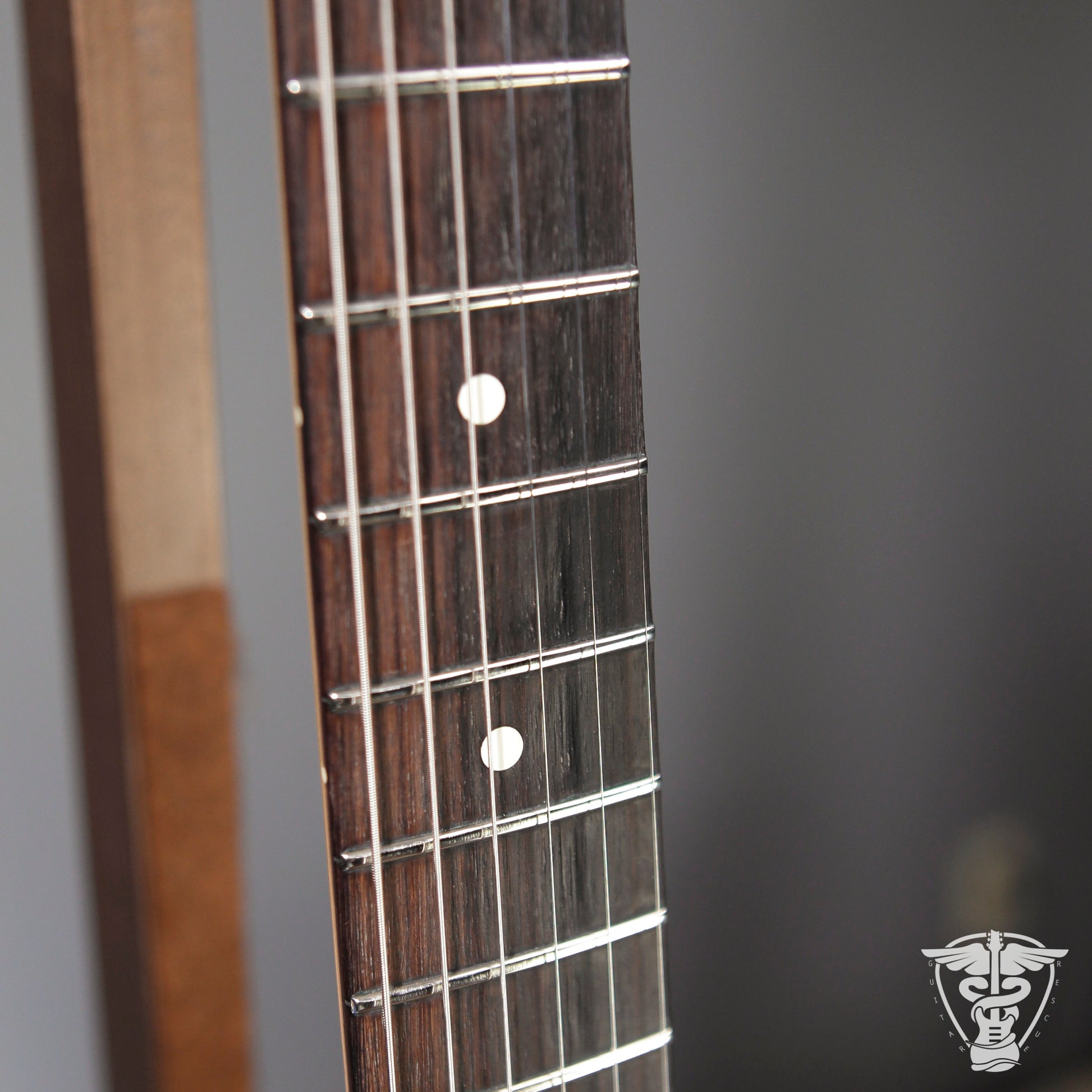 Neck/Headstock: Satin neck finish has worn to semi-gloss. A few tiny impressions throughout neck. Tiny spots of lacquer blush along fretboard edges. A few tiny dings in headstock edges. Play wear impressions in fretboard.